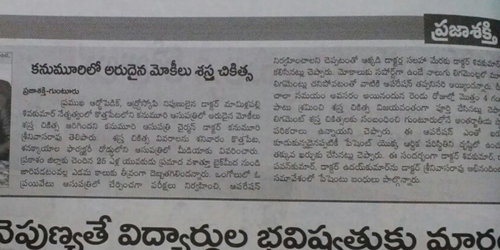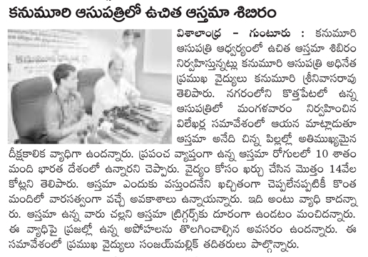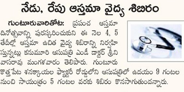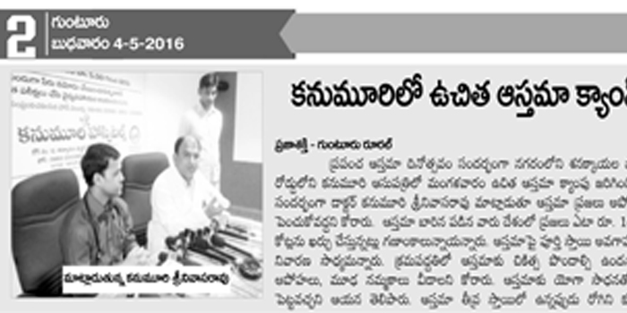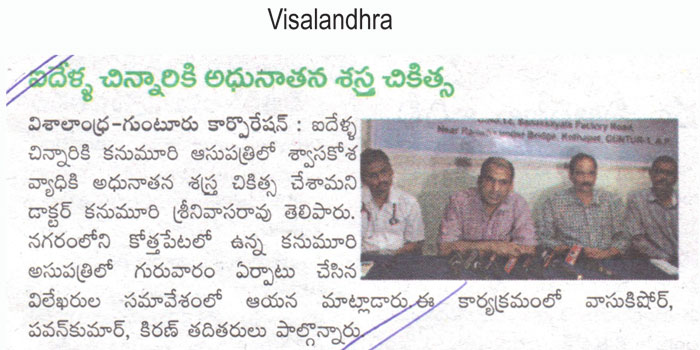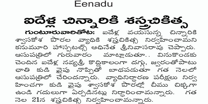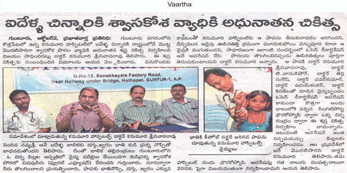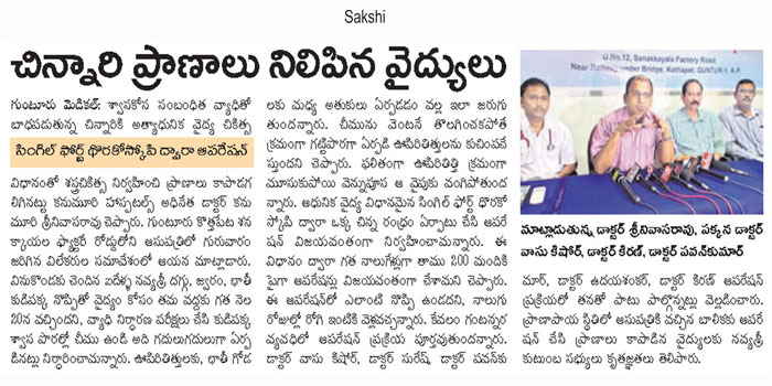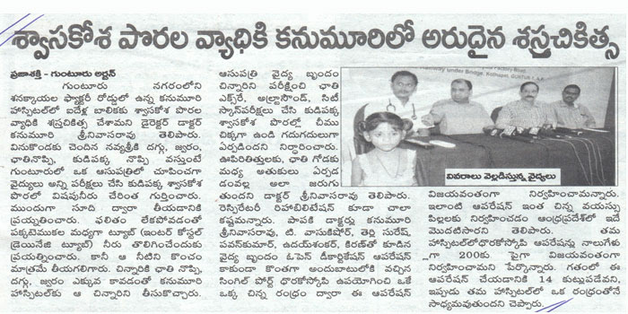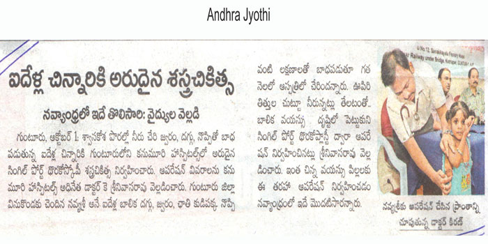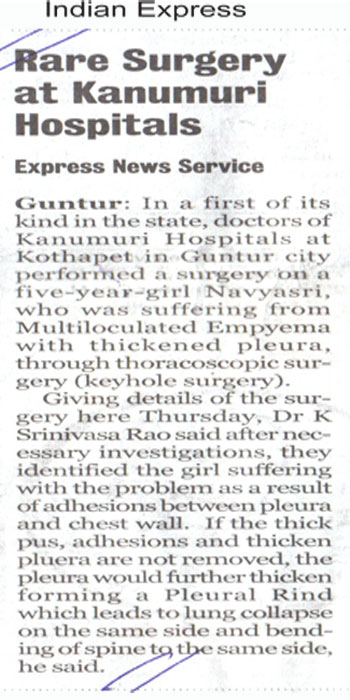 Thoracoscopic Surgery:For the first time in Andhra Pradesh state, doctors at Kanumuri Hospitals in Guntur city performed a surgery on a five-year-old girl, who was suffering from Multiloculated Empyema with thickened pleura, through thoracoscopic surgery (keyhole surgery).